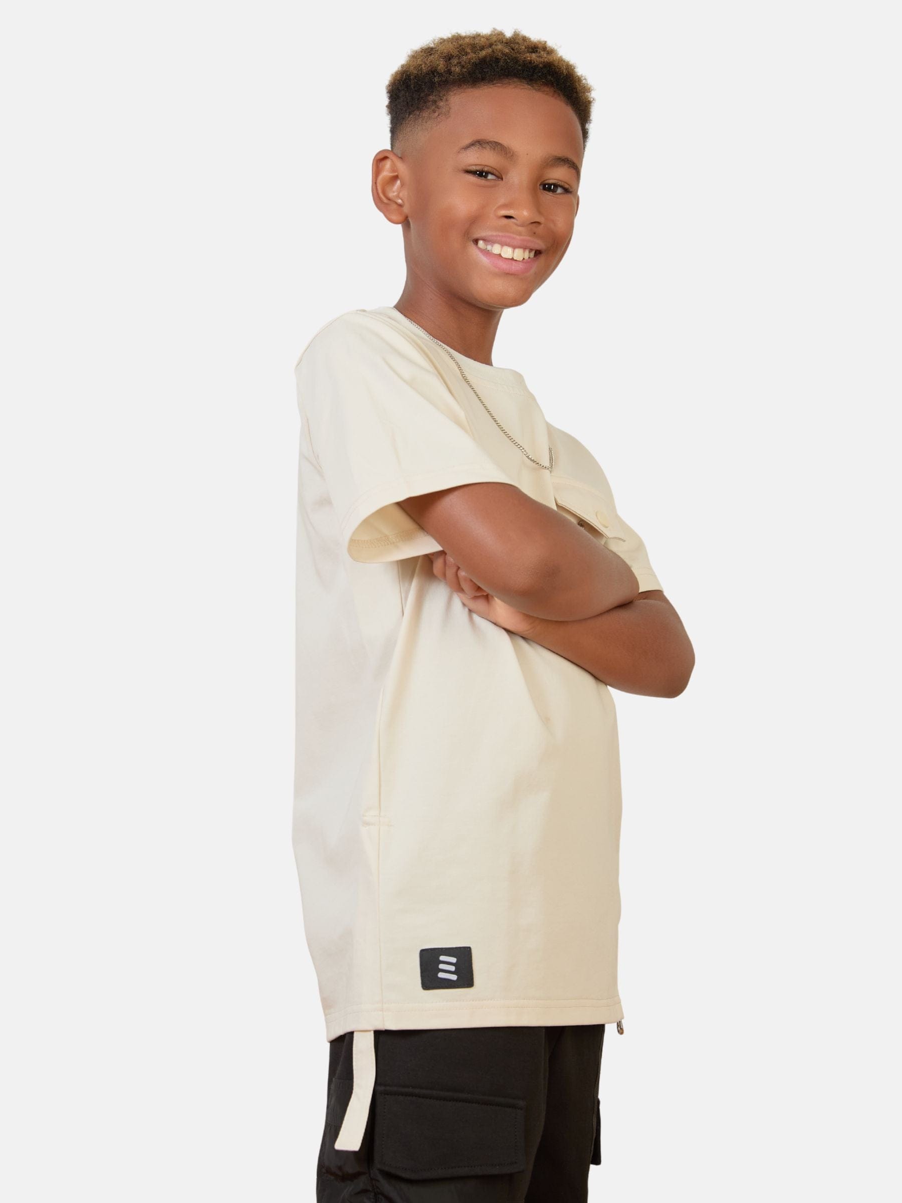 The Beige Utility T-Shirt brings a modern twist to luxury children’s clothing with its refined details and versatile design. Crafted from a premium matte cotton-poly blend, this elevated tee combines comfort with functionality—perfect for both play and polished occasions.