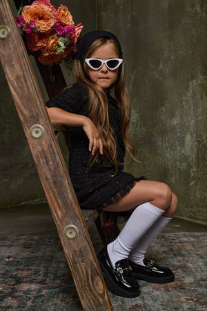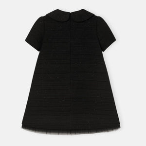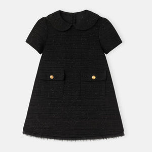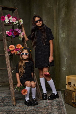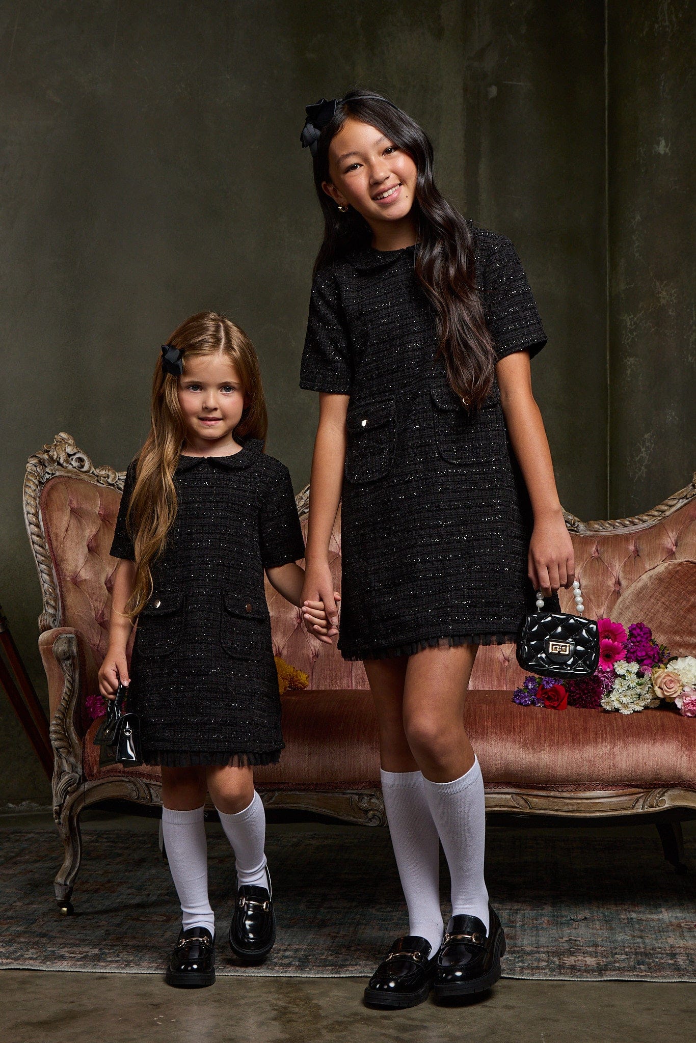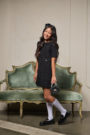 The Colette Dress combines chic sophistication with playful charm, making it a standout piece in luxury children’s fashion. Crafted from a structured black knit with subtle stretch, this timeless silhouette is elevated by a crisp Peter Pan collar and gold-button pocket details.