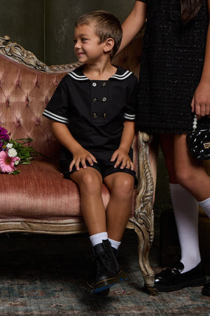 Step up your little one's style game with the Langston Shirt and Shorts Set in Black. This sleek and sophisticated set features a classic button-down shirt paired with perfectly tailored shorts, creating a polished look for any occasion. Crafted from high-quality fabric, it offers both comfort and elegance. The timeless black color makes it versatile and effortlessly chic, ideal for formal events or a stylish day out. Elevate his wardrobe with the Langston set, where classic meets contemporary.